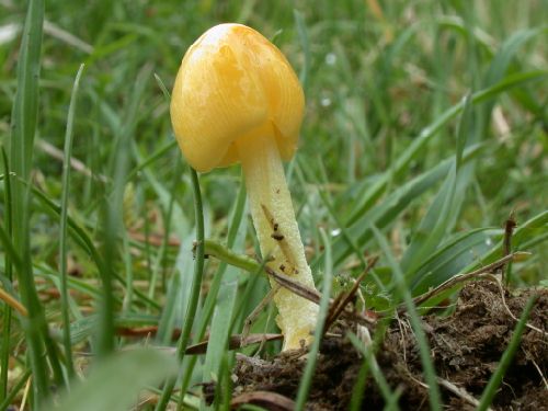 Report: (SJS): The first foray of the year saw a good turn out of members including newcomers to the group Jacqui Darby and Carole Fenning who had travelled from Hertfordshire, not solely to join us I have to add. Martin Down is one of those fringe areas that have changed counties and is now in VC8 and Hampshire. The most prevalent of the larger spring fungi was Verpa conica (Thimble morel) which from other reports seems to have enjoyed a good year along with Calocybe gambosa (St George's Mushroom). Tina found one fine specimen of Agaricus campestris (Field mushroom) and several specimens of Bolbitius titubans (formerly vitellinus) provided a good photo opportunity. Amongst the lignicolous fungi Alan found Hymenochaete carpatica and Vuilleminia cystidiata with 9 and 31 previous records on the FRDBI respectively. The V. Cystidiata was new for VC8 and the only previous record in Hampshire was from last year at Baddesley Common. A couple of the firesites produced several ascos of which the most unusual was Tricharina praecox, an orange cup whose fruitbody was buried in the ash rather than lying on the surface. The other new record for the group, Pyrenopeziza pulveracea, a 'black dot' found by Sue growing on Filipendula ulmaria (meadow-sweet).