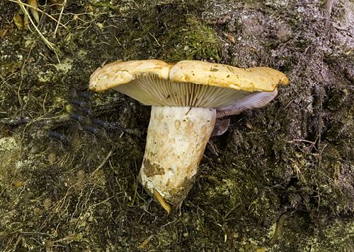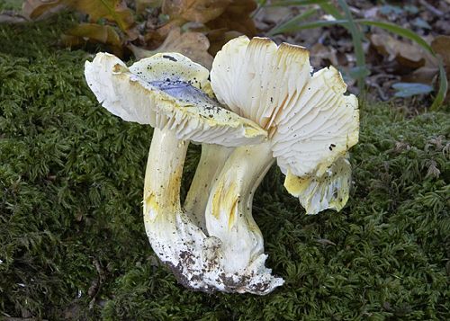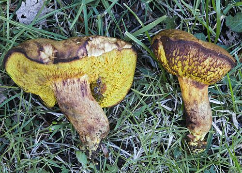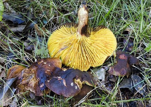Report: (Mark Jackson) Forayers were out in their droves today as a sizeable gathering mustered in the car park. Once we were organised and Sue had entered all of our names into a laptop, we set off. Thirty seconds into the foray I stumbled across a small troop of Phylloporus rhodoxanthus Syn (pelletieri) a species that is listed as a priority species on the UK Biodiversity Action Plan (UKBAP). Once I had showed Eric he erupted with excitement as he has only seen this species once before and Alan has only seen it a few times before. According to our website there are only two records for this species and neither of these records are in the New Forest. As we were nearing the time and place for lunch, the species list was already quite substantial and Alan was having trouble keeping up with a non-stop trickle of forayers turning up with specimens in hand, Eric once again had too many Russulas to identify at home and Paul was valiantly keeping up with the many photo opportunities. Not far from the lunch spot Alan pointed out specimens of Phellinus robustus occupying one of the six known sites in the forest. We skirted along the edge of the woodland and followed a ride which produced Hydnellum concrescens and later Hydnellum spongiosipes both in the early stages of development. Both these species are vulnerable and are priority species listed on the UKBAP. After lunch the list continued to grow and Alan was forced to leave the ubiquitous Trochila ilicina and Biscogniauxia nummularia off of the list as there was not enough room left on the recording sheets. Species that caught the attention of the eye during the foray were an easily identifiable webcap, Cortinarius purpurascens with its remarkable deep lilac colouring on cutting and the delightfully diminutive Mycena stylobates, the beautifully plum coloured base of Boletus queletii, the golden yellow of Tricholoma sejunctum and the metallic yellow of Hypomyces chrysospermus in its conidial stage. On our way back to the car park we were rewarded with Xerocomus chrysonemus showing its yellow mycelium and the uncommon Lactarius controversus which was found not far from the car park. All in all a very productive day with several vulnerable and uncommon species found.