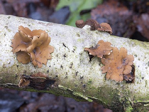 Report: After the foray at Crab Wood before Christmas was cancelled due to bad weather there was a ground swell of opinion to hold the event early in January, weather still permitting. The opportunity to enjoy Sue and Eric’s hospitality was also not to be missed! There was a good turnout of members for a chilly damp January day which turned out to be surprisingly productive after such a prolonged frozen period of time with a total of 65 records. Shortly after leaving the car park an elder tree was cloaked in a fine display of Auricularia auricula-judae (Jelly ear) and Flammulina velutipes (Velvet Shank). The former was found in profusion throughout the morning foray. For those who had not seen Phylloporia ribis before it was ‘showing nicely’ once again. Specimens of Encoelia furfuracea (Spring Hazelcup) provided an excellent photo opportunity for Paul and others. Despite the weather there were several specimens of small delicate mycenas on the trunk and branches of trees and amongst the decaying wood there were several collections of