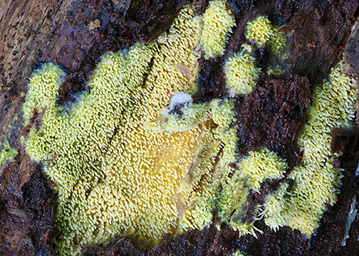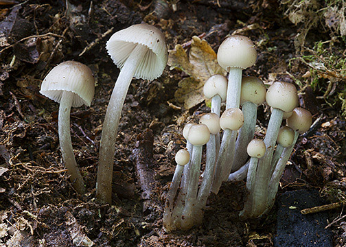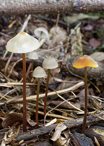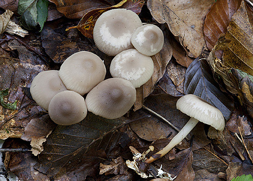 There has been a notable lack of mycorrhizal species so far this year but the recent damp weather has finally encouraged the saprotrophic Agarics to start fruiting. There were numerous displays of Mycena haematopus (Burgundydrop Bonnet) and M inclinata (Clustered Bonnet)and numerous Pluteus cervinus (Deer Shield) and Lycoperdon pyriforme (Stump Puffball) on the rotting logs and Marasmius wynnei (Pearly parachute) and M cohaerens and another "bleeding" mycena - M crocata (Saffrondrop Bonnet) - on the leaf litter. M. wynnei has a darkening stipe base and a characteristic, sweetish smell while M cohaerens is very tough, due to the 'spinulae' in the gills, stipe and cap cuticle. Sue Lambert found a good showing of the less common Ganoderma applanatum (Artist's Bracket) on a log near to the car park with its softish cap contrasting with that of the G australe (Southern Bracket) on the same log. An older Ganoderma fruit body also played host to Trechispora nivea. Nothing particularly rare was identified but much of the material was very fresh and it was heartening to see the “cap'nstems” finally giving the paint fungi a run for their money, even if the only mychorrizal specimens were just a couple of Lactarus and a lone Russula ochroleuca...
