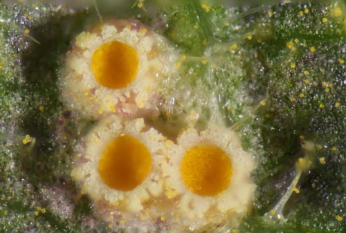 Report: Not to be discouraged by the continuing lack of April showers a small group set off into the wetter areas of the Leckford Estate ably guided once again by Glynne Evans and considering all the twists and turns and many small bridges we passed it was a good job we had someone with local knowledge. As the fisherman had not yet returned for the season we could venture into the wetter areas near the water's edge. There was however a distinct lack of any cap and stem fungi apart from a solitary Bolbitius titubans (Yellow Fieldcap) which meant most of the finds were small fungi on plants including several rusts and other microfungi which provided some microphotographic challenges. However for those that ‘like em big’ Sara found a magnificent young specimen of Laetiporus sulphureus (Sulphur Polypore) growing all along a willow trunk which was quite out of keeping with the rest of the day's finds. As the group is not in the habit of looking at microfungi a few new species to the group were to be found amongst the day's records.