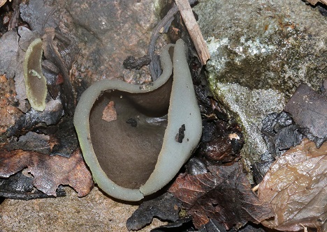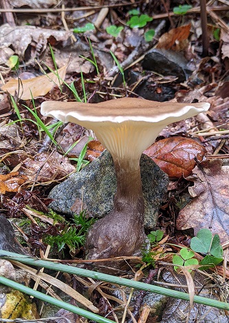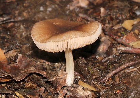 Further along, the track became barer with a stony substrate and here we found several Pluteus phlebophorus (Wrinkled Shield), a large example of Ampulloclitocybe clavipes (Club Foot), Lepista nuda (Wood Blewit), Mycena rosea (Rosy Bonnet) and some dark-centred Peziza sp. (cup fungi). A twig of Hazel bore a nice troop of Marasmiellus vaillantii (Goblet Parachute) and there were clumps of Lacrymaria lacrymabunda (Weeping Widow) and Pholiota gummosa (Sticky Scalycap).