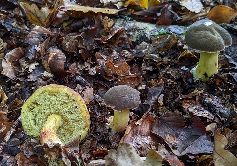 There was a steady stream of finds from the moment we left the car park and headed down the sloping path into the wood. Boletus edulis (Cep), Lactarius blennius (Beech Milkcap), Boletus cisalpinus (Bluefoot Bolete), Russula sardonia (Primrose Brittlegill) and Amanita rubescens (Blusher) were seen on the banks beside the track. We then examined some fallen Beech logs which sported some fine examples of Trametes gibbosa (Lumpy Bracket) and a puzzling bracket with a smooth grey upper surface and minutely, white-pored underside. There was also the resupinate, Laxitextum bicolor and a patch of the yellow, toothed crust, Mycoacia uda. Nearby, several Lycoperdon excipuliforme (Pestle Puffball) were seen.