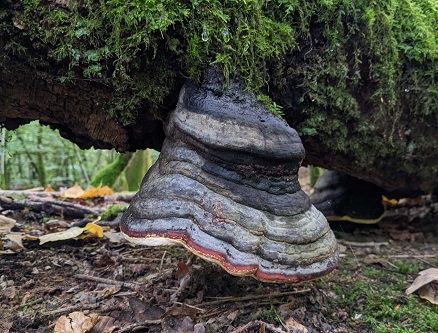 Taking a grassy side-track, the discoveries continued apace. Leccinum aurantiacum (Orange Oak Bolete), Calocera pallidospathulata (Pale Stagshorn), Mycena pelianthina (Blackedge Bonnet) and a couple of fine specimens of the scarce Fomotopsis pinicola (Red-belted Bracket) on Beech. A green Russula was thought to be R. aeruginea (Green Brittlegill) and some Clavulina coralloides (Crested Coral) was found.