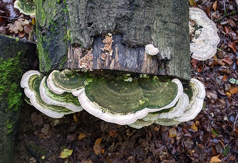 Species recorded: Aleurodiscus wakefieldiae, Amanita muscaria var. muscaria, Amanita rubescens var. rubescens, Ampulloclitocybe clavipes, Bjerkandera adusta, Boletus badius, Boletus cisalpinus, Boletus edulis, Boletus luridiformis var. luridiformis, Boletus pruinatus, Bulgaria inquinans, Calocera cornea, Calocera pallidospathulata, Calocera viscosa, Clavulina coralloides, Coprinellus micaceus, Coprinopsis atramentaria, Coprinopsis lagopus, Crepidotus applanatus, Crepidotus cesatii, Crepidotus variabilis, Exidia glandulosa, Fistulina hepatica, Fomitopsis pinicola, Ganoderma australe, Gymnopilus junonius, Gymnopilus penetrans, Gymnopus dryophilus, Helvella lacunosa, Hydnum repandum, Hygrophoropsis aurantiaca, Hymenochaete rubiginosa, Hypholoma fasciculare var. fasciculare, Laccaria amethystina, Lacrymaria lacrymabunda, Lactarius blennius, Lactarius glyciosmus, Lactarius quietus, Lactarius tabidus, Laetiporus sulphureus, Laxitextum bicolor, Leccinum aurantiacum, Lepista nuda, Lycoperdon excipuliforme, Marasmiellus vaillantii, Marasmius rotula, Megacollybia platyphylla, Melanoleuca polioleuca, Meripilus giganteus, Mycena corynephora, Mycena galericulata, Mycena galericulata, Mycena haematopus, Mycena inclinata, Mycena pelianthina, Mycena rorida, Mycena rosea, Mycena speirea, Mycena vitilis, Mycoacia uda, Neobulgaria pura var. pura, Oudemansiella mucida, Oxyporus latemarginatus, Parasola schroeteri, Paxillus involutus, Peziza, Pholiota gummosa, Piptoporus betulinus, Pluteus cervinus, Pluteus phlebophorus, Polyporus leptocephalus, Rhopographus filicinus, Rickenella fibula, Russula aeruginea, Russula amoenolens, Russula atropurpurea, Russula brunneoviolacea, Russula cyanoxantha, Russula densifolia, Russula fragilis var. fragilis, Russula nigricans, Russula risigallina, Russula sardonia, Russula velenovskyi, Russula vesca, Schizophyllum commune, Stereum hirsutum, Trametes gibbosa, Trametes versicolor, Trichoderma citrinum
