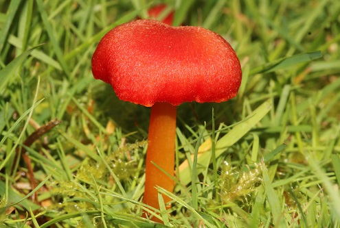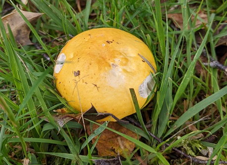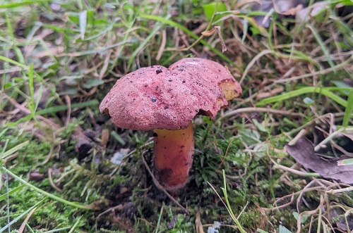 When we emerged onto some damp grassland the finds picked up again, with some nice Russula claroflava (Yellow Swamp Brittlegill), Clitopilus prunulus (The Miller) and many Scleroderma verrucosum (Scaly Earthball). A few bright scarlet waxcaps studded the lawn and were a nice subject for the photographers. They were Hygrocybe helobia (Garlic Waxcap).