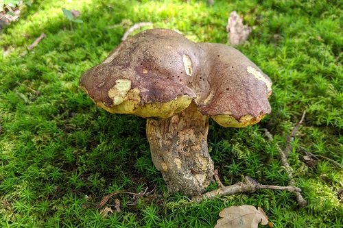 We then headed back along the gravel path towards the car park. At the side of the track we found several boletes. One had a rose-pink cap, yellow pores and turned dark blue when handled, quickly coating the stipe and the fingers of the handlers! It proved to be Boletus pulverulentus (Inkstain Bolete). A second, was a bolete with an unremarkable matt brown cap, Boletus aereus (Bronze Bolete) and a third, larger species, with a rather convoluted cap and red netting on the stipe was Butyriboletus appendiculatus (Oak Bolete). As well as these, we also found Russula graveolens (with a strong odour of shellfish), a small yellowish oysterling with dark brown scales on the cap, Crepidotus calolepsis and, on a fallen willow, the parasitic Tremella foliacea (Leafy Brain).