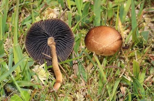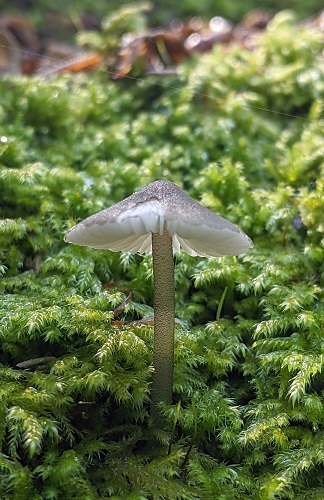 There was a spot of drizzle as we headed down the grass clearing where we saw several groups of the dark-gilled Hypholoma ericaeum. On re-entering the wood, we discovered Mycena pelianthina (Blackedge Bonnet) and the ‘eggs’ of Phallus impudicus (Stinkhorn).