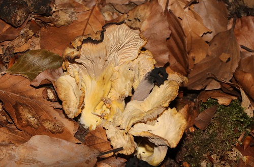 Several Hymenopellis radicata (Rooting Shank) were found and then some clumps of Craterellus cornucopioides (Horn of Plenty). Amongst the latter we then discovered the rarer Cantharellus melanoxeros (Blackening Chanterelle). This species was a pale yellowish in colour with blackening rims to the rather misshapen trumpets, the underside of which had much deeper grooves than that of the Craterellus.