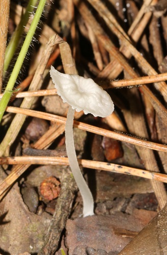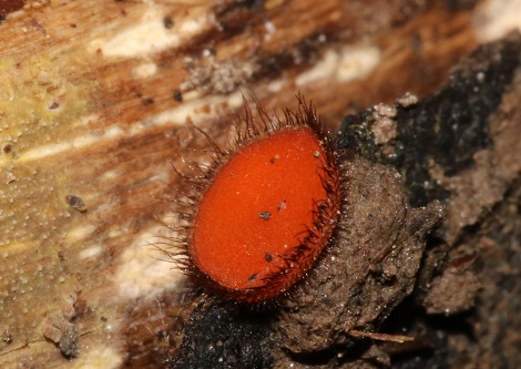 Continuing down the slope, we then came to a damp ditch, the banks of which had a fine colony of Thelephora penicillata (Urchin Earthfan) and quite a few of the fragile little white mushrooms, Delicatula integrella. A few pieces of damp wood bore the tiny eyelash fungus, Scutellinia crinita.
