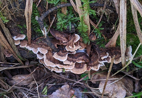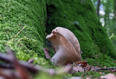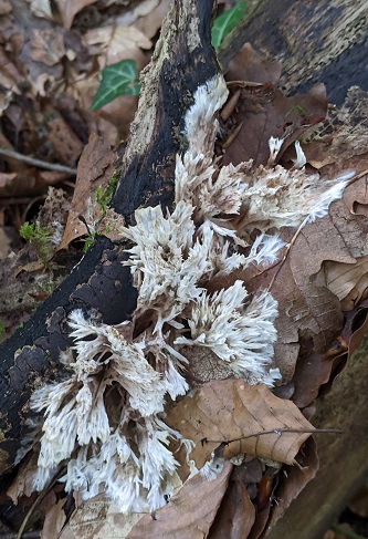 Species recorded: Amanita citrina var. citrina (False Deathcap), Asterophora lycoperdoides (Powdery Piggyback), Bjerkandera adusta (Smoky Bracket), Calocera viscosa (Yellow Stagshorn), Cantharellus tubaeformis (Trumpet Chanterelle), Chlorociboria aeruginascens (Green Elfcup), Cortinarius bolaris (Dappled Webcap), Craterellus cornucopioides (Horn Of Plenty), Craterellus melanoxeros (Blackening Chanterelle), Daedaleopsis confragosa (Blushing Bracket), Daldinia concentrica (King Alfred's Cakes), Delicatula integrella, Fomitopsis betulina (Birch Polypore), Ganoderma adspersum (Southern Bracket), Gymnopus confluens (Clustered Toughshank), Heterobasidion annosum (Root Rot), Hydnum repandum (Wood Hedgehog), Hygrocybe helobia (Garlic Waxcap), Hymenopellis radicata (Rooting Shank), Infundibulicybe gibba (Common Funnel), Inocybe curvipes, Inocybe geophylla var. geophylla (White Fibrecap), Inocybe rimosa (Split Fibrecap), Laccaria laccata (Deceiver), Lacrymaria lacrymabunda (Weeping Widow), Lactarius camphoratus (Curry Milkcap), Laxitextum bicolor, Lycoperdon nigrescens (Dusky Puffball), Lycoperdon perlatum (Common Puffball), Mycena amicta (Coldfoot Bonnet), Mycena filopes (Iodine Bonnet), Panellus stipticus (Bitter Oysterling), Phaeolus schweinitzii (Dyer's Mazegill), Phallus impudicus var. impudicus (Stinkhorn), Phlebia radiata (Wrinkled Crust), Physisporinus sanguinolentus (Bleeding Porecrust), Pluteus cervinus (Deer Shield), Pluteus nanus (Dwarf Shield), Polyporus leptocephalus (Blackfoot Polypore), Psathyrella candolleana (Pale Brittlestem), Russula cyanoxantha (Charcoal Burner), Russula pseudo-olivascens,), Russula vesca (The Flirt), Schizopora radula, Scleroderma areolatum (Leopard Earthball), Scleroderma citrinum (Common Earthball), Scutellinia crinita, Skeletocutis amorpha (Rusty Crust), Skeletocutis semipileata (Hazel Bracket), Stereum hirsutum (Hairy Curtain Crust), Stereum sanguinolentum (Bleeding Conifer Crust), Stereum subtomentosum (Yellowing Curtain Crust), Thelephora penicillata (Urchin Earthfan), Trametes versicolor (Turkeytail), Xylaria hypoxylon (Candlesnuff Fungus), Xylaria polymorpha (Dead Man's Fingers)