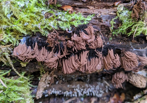 Lactarius camphoratus (Curry Milkcap) was the next find, with a strong scent to match its name and then, a less pleasant aroma, led us to Phallus impudicus (Stinkhorn) and, nearby, an interesting slime-mould, Stemonitis fusca, with brush-like filaments was seen on a fallen log.