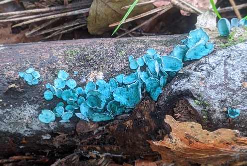 There was a profusion of the, usually shy-fruiting, Chlorociboria aeruginascens (Green Elfcup) and some fine examples of Lycoperdon excipuliforme (Pestle Puffball), whilst around a stand of birch we recorded Tricholoma fulvum (Birch Knight), Leccinum scabrum (Brown Birch Bolete) and Lactarius tabidus (Birch Milkcap).