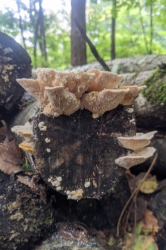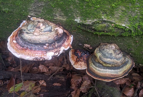 Species recorded: Amanita citrina var. citrina, Amanita excelsa var. spissa, Amanita fulva, Amanita rubescens var. rubescens, Auriscalpium vulgare, Boletus chrysenteron, Boletus edulis, Boletus luridiformis var. luridiformis, Boletus pruinatus, Bulgaria inquinans, Calocera viscosa, Cantharellus cibarius, Cantharellus tubaeformis, Ceriporiopsis gilvescens, Chalciporus piperatus, Chlorociboria aeruginascens, Clitopilus hobsonii, Clitopilus prunulus, Coprinellus micaceus, Coprinopsis lagopus, Cortinarius bolaris, Cortinarius flexipes, Cortinarius violaceus, Craterellus sinuosus, Crepidotus cesatii, Crepidotus variabilis, Daedalea quercina, Daedaleopsis confragosa, Fistulina hepatica, Fomitopsis betulina, Fomitopsis pinicola, Galerina marginata, Gymnopus confluens, Gymnopus dryophilus, Gymnopus erythropus, Helvella crispa, Heterobasidion annosum, Hydnum repandum, Hydnum rufescens, Hymenochaete rubiginosa, Hymenoscyphus fructigenus, Inocybe geophylla var. geophylla, Laccaria amethystina, Lacrymaria lacrymabunda, Lactarius camphoratus, Lactarius tabidus, Lactarius vellereus, Lanzia echinophila, Laxitextum bicolor, Leccinum scabrum, Leotia lubrica, Lycoperdon excipuliforme, Lycoperdon perlatum, Megacollybia platyphylla, Mucidula mucida, Mutinus caninus, Mycena arcangeliana, Mycena corynephora, Mycena filopes, Mycena galericulata, Mycena galopus var. galopus, Mycena haematopus, Mycena pelianthina, Mycena stylobates, Mycena tenerrima, Neobulgaria pura var. pura, Panellus stipticus, Paxillus involutus, Phallus impudicus var. impudicus, Phlebia livida s. lat. , Phlebiopsis ravenelii, Physisporinus sanguinolentus, Pleurotus ostreatus, Pluteus cervinus, Polyporus leptocephalus, Polyporus tuberaster, Psathyrella candolleana, Psathyrella piluliformis, Rhodocollybia maculata, Rickenella fibula, Russula atropurpurea, Russula betularum, Russula cyanoxantha, Russula densifolia, Russula risigallina, Russula virescens, Schizopora paradoxa, Scopuloides rimosa, Scytinostroma portentosum, Sidera vulgaris, Simocybe sumptuosa, Stereum gausapatum, Stereum hirsutum, Stereum subtomentosum, Trametes betulina, Trametes gibbosa, Trametes versicolor, Trichaptum abietinum, Tricholoma fulvum, Tubaria conspersa, Tyromyces chioneus, Xylaria polymorpha, Xylodon crustosus