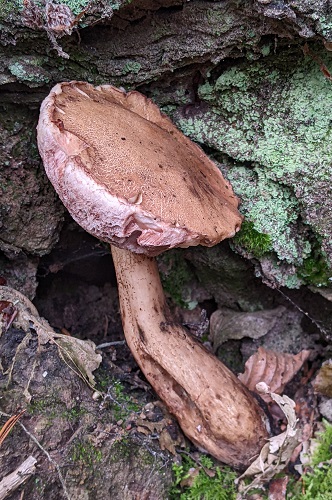 A mature bolete with pink pores and a netted stipe was identified as Tylopilus felleus (Bitter Bolete) and nearby, a more palatable, Chalciporus piperatus (Peppery Bolete) was found and tasted by some.