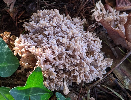 Some of the grassland fungi were frost-nipped but the first lawn investigated produced a fine display of Clitocybe geotropa (Trooping Funnel), Paralepista flaccida (Tawny Funnel) and Cuphophyllus virgineus (Snowy Waxcap). In the border of some nearby rhododendron bushes there were many Lepista nuda (Wood Blewit) and some Clavulina cinerea (Grey Coral).