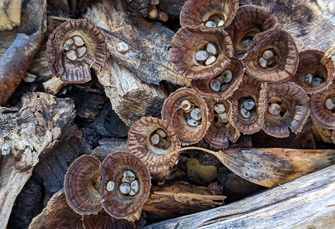 After an early lunch on the lawn, our guide, Linda, led us to a children’s play area where there was a variety of fallen logs laid on a bed of woodchip. The pine logs produced Stereum sanguinolentum (Bleeding Conifer Crust) and the uncommon Gloiophyllum sepiarium (Conifer Mazegill) whilst the broadleaf wood had Schizophyllum commune (Splitgill) and Lenzites betularum (Birch Mazegill). In the woodchip there was a mass of Cyathus striatus (Fluted Bird’s Nest), some Tubaria furfuracea (Scurfy Twiglet), Leratiomyces ceres (Redlead Roundhead) and a patch of the beautiful Aleuria aurantia (Orange Peel Fungus).