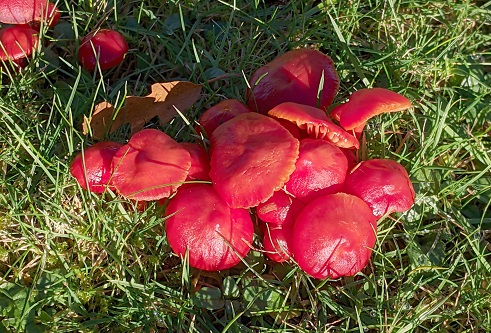 As usual, the lawns in front of the grand Exbury House were awash with waxcaps, though many were affected by the frost. The large Hygrocybe punicea (Crimson Waxcap) dominated but there was also Gliophorus irrigatus (Slimy), G. psittacinus (Parrot) and Hygrocybe conica (Blackening). Other species present included Clavaria fumosa (Smoky Spindles), C. acuta (Pointed Club), Clavulinopsis corniculata (Meadow Coral) and Lycoperdon utriforme (Mosaic Puffball).