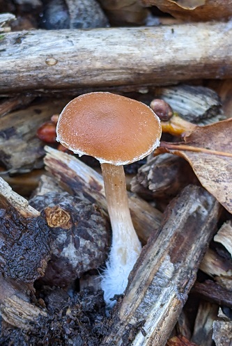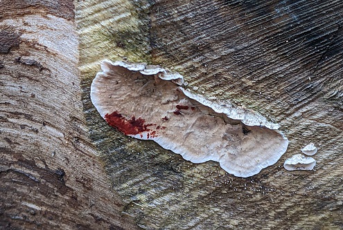 In an area of fallen pines, there was plenty of Gymnopilus penetrans (Common Rustgill) and a small patch of the bright orange, merulioid resupinate, Leucogyrophona mollusca.