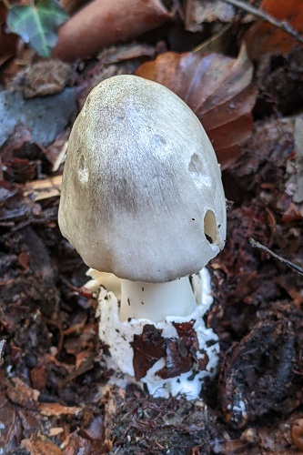 On to a shrubby area, where we soon found Clavaria flavipes (Straw Club), Psilocybe cyanescens (Blueleg Brownie) and both Helvella crispa and H. lacunosa (White and Elfin Saddle). An emerging Volvopluteus gloiocephalus (Stubble Rosegill) caused some head-scratching at first but soon two mature fruit-bodies were found close by.